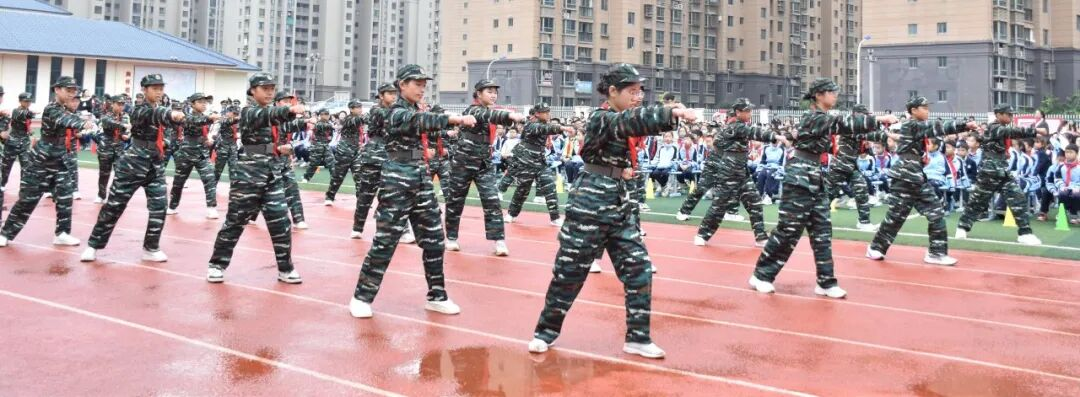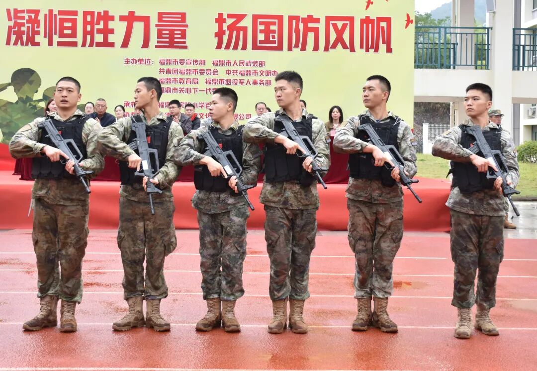 现场为“福鼎市少年军校”授牌后,校长为驻校教官颁发聘书,这些教官均由驻鼎部队精心选派,承载着军民共育的责任。教官迈正步授校旗,学员代表接旗后高举,全体学员行队礼致敬,军地同心的画面格外动人。校大队委陈飘楠带领学员宣誓,“热爱祖国、尊崇国防”的誓言响彻校园;某驻鼎部队官兵带来刚劲有力的军体拳表演,用军人风采点燃少年热情,更彰显军地双拥共建的深厚情谊。首批学员随后展示队列、拳术、枪术及旗语操、感恩手势操,动作整齐、气势昂扬,尽显“恒胜少年”在双拥氛围滋养下的精神风貌。